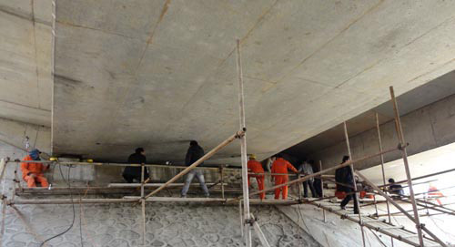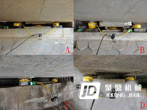 首先我司工作人員對鎮江路段橋梁的跨距、每跨的梁片數、梁片的結構形式以及橋梁的高度進行現場現場勘察。并查看相關圖紙核實橋梁縱向連續梁片數,從而初步計算出梁體重量及荷載能力。然后經過測量梁片與墩臺之間的實際距離,研究放置千斤頂的位置及臨時支撐位置。討論現場施工操作人員、觀察人員的位置以及整個施工環境。