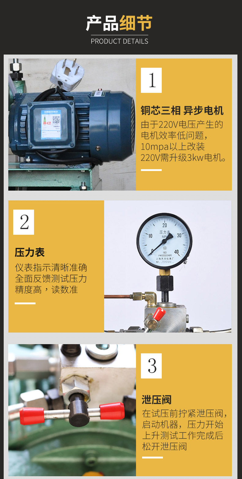 1. 若需要6缸的試壓泵,請(qǐng)選用 DSB電動(dòng)試壓泵(2.5-40Mpa)