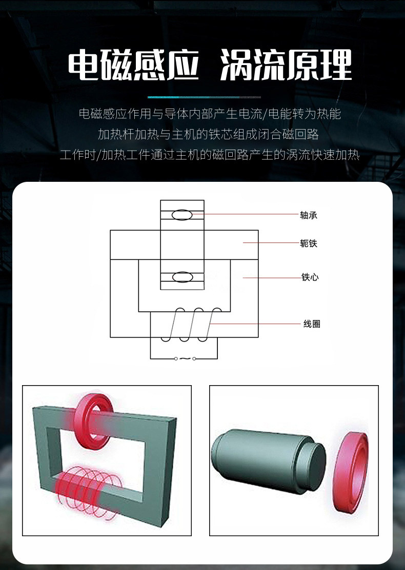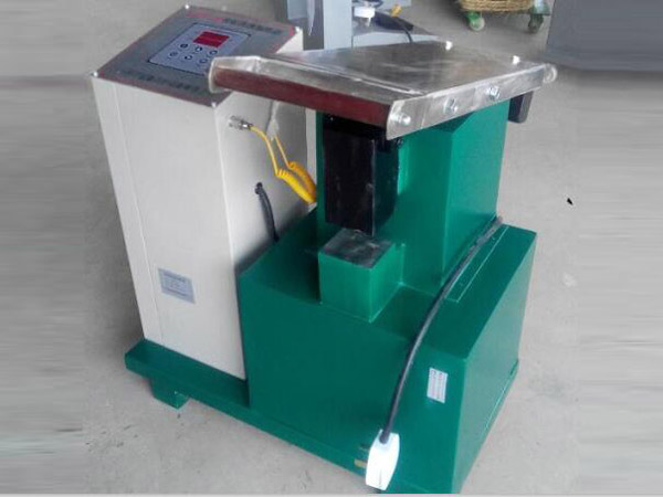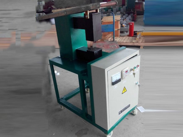 4、被加熱工件放置到主機鐵蕊中間活動軛鐵的下面,輕輕向下移動,使之與工件吻合(若工件厚度尺寸不變,可調節主機后杠桿橋下面的定位螺釘,使軛鐵與工件保持2mm的間距,以方便連續操作)。至此,調試結束,可投入使用。
